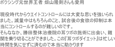日本で初めてダイエットと耳ツボの関係に着目し、ボクシングの元世界チャンピオンで現在はタレントとして活躍している、畑山隆則さんの減量にもカを貸した鈍灸師 勝田先生の実際に行われている施術を元に開発されました。
